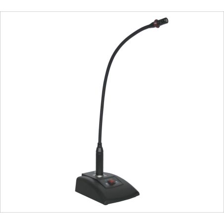 Profesjonalny mikrofon pulpitowy. Elektretowa wkładka pojemnościowa. Jasny i czysty dźwięk. Kontrolka LED wskazująca włączenie mikrofonu. Wysoka czułość i niski poziom szumów własnych. Elastyczna gęsia szyja pozwala na dostosowanie pozycji mikrofonu w każdej sytuacji. Metalowa podstawa gwarantuje dobrą stabilność. Symetryczne wyjście ze złączem XLR. Akcesoria: wiatrochron z gąbki oraz przewód połączeniowy. Zastosowanie: Systemy PA, sale konferencyjne, otwarte przestrzenie i wiele innych.