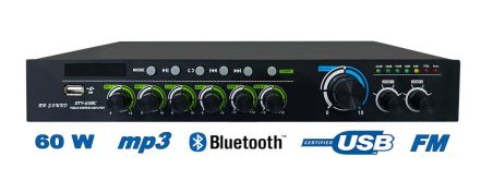 Małogabarytowy radiowęzłowy wzmacniacz cyfrowy o mocy 60Wrms/ 100V, 4-16Ohm, Wyjścia na 2 strefy o regulowanej głośności, kompaktowe wymiary, wbudowany odtwarzacz Mp3/USB, BLUETOOTH, Radio FM, Wejścia: 2 x mikrofon, 1 x uniwersalne AUX, Wyjścia: 1 x AUX